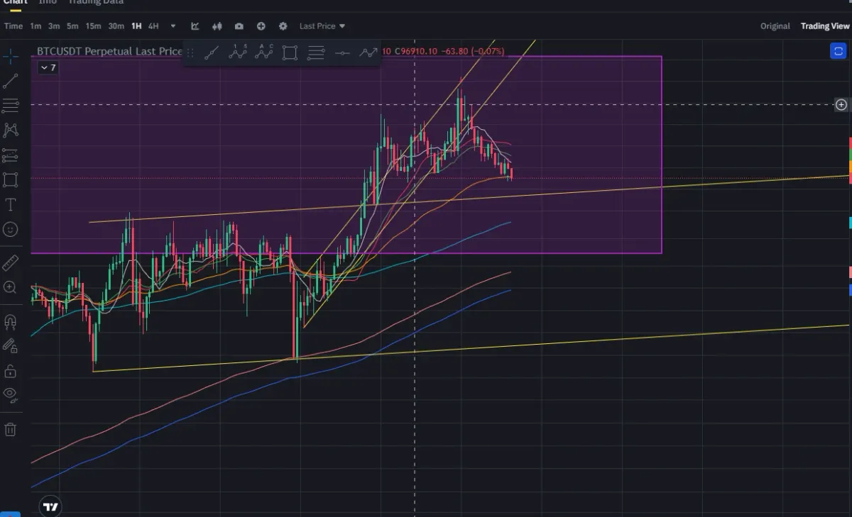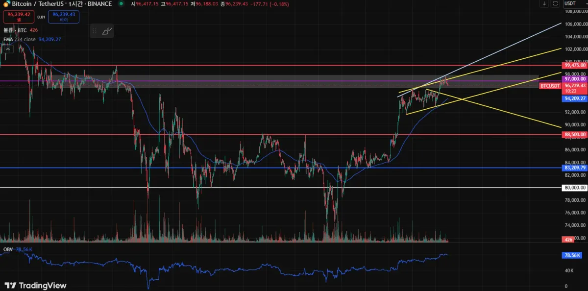 진입 근거 1시간, 4시간 봉 보면 2월 5일 부터의 매물대 몰려 있다는 것을 확인을 했습니다. 비트코인 상승을 하더라고 저기 부분 때문에 한번에 돌파를 하지 못할 거라 판단하여 97000쯤에 오면 숏 포지션을 계획 하였습니다.