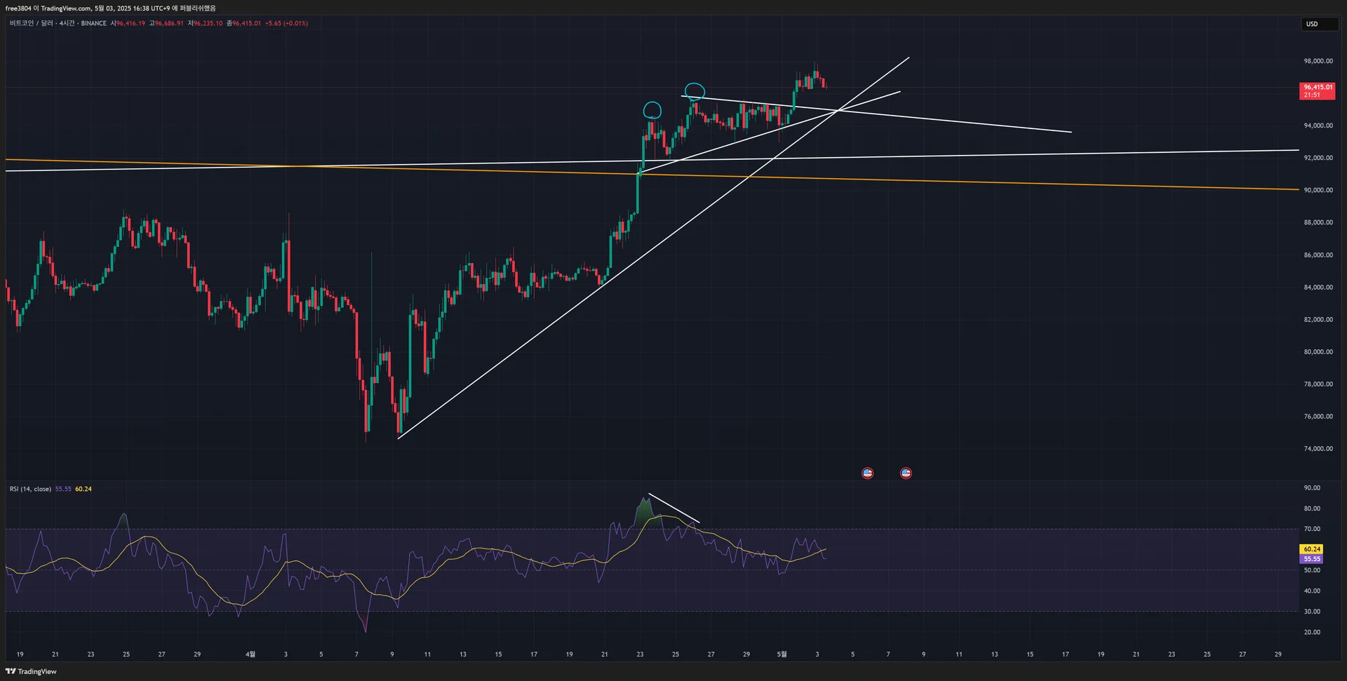 BTC 4시간 봉 기준 파란색 동그라미 친 두 곳을 기준으로 하락 다이버전스 체크