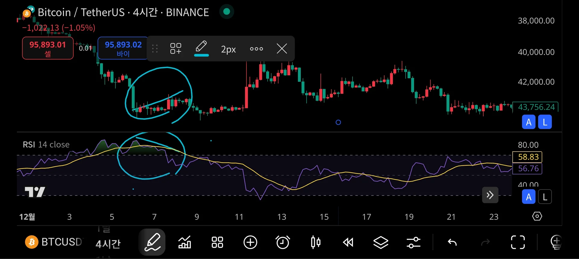 강의 시간에 배운대로 찾아보니 고점은 높아지는데 RSI는 낮아지고 있는게 보여서 하락다이버전스로 체크해봤습니다.