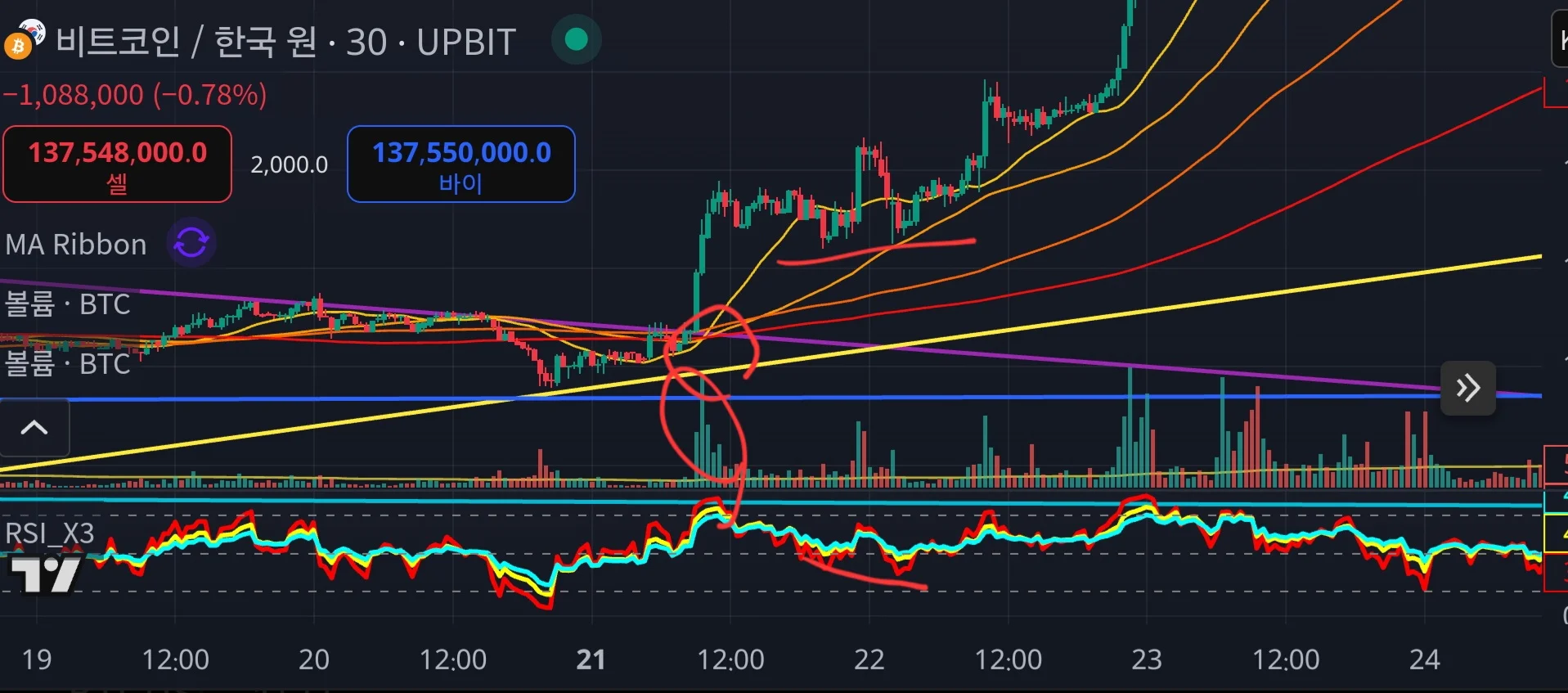 골든크로스 출현 ㅡ> 정배열로 바뀜
