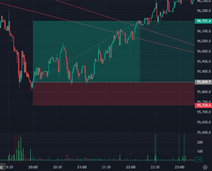 상승분의 0.382 부근이라 진입했고, 빠르게 내리면 이전 매물대 95,300부근까지 내릴 가능성도 농후해보여서 97,750 부근에 손절 걸고 진행했습니다.