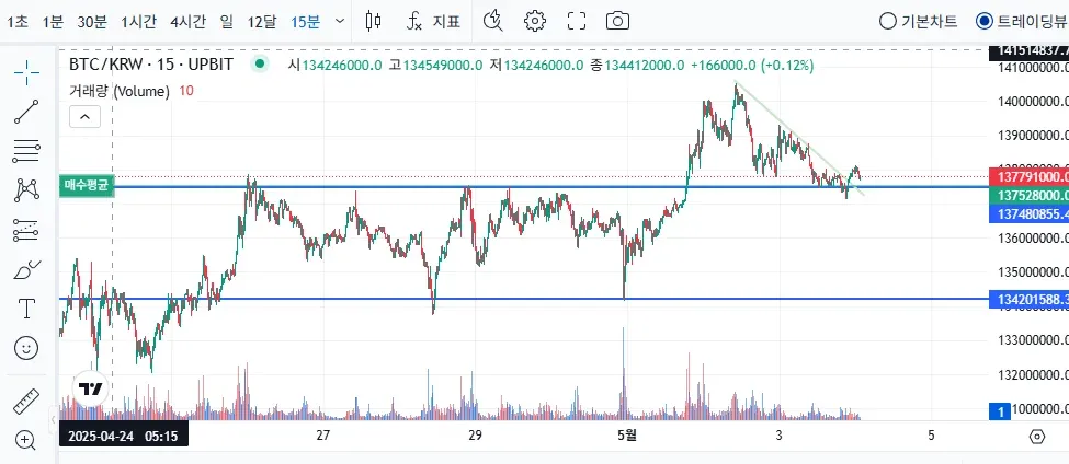 계획은 지지선이 깨지고 136,000,000원이 깨지면 손절하고, 반등한다면 쭈욱 가져가 볼 계획입니다.