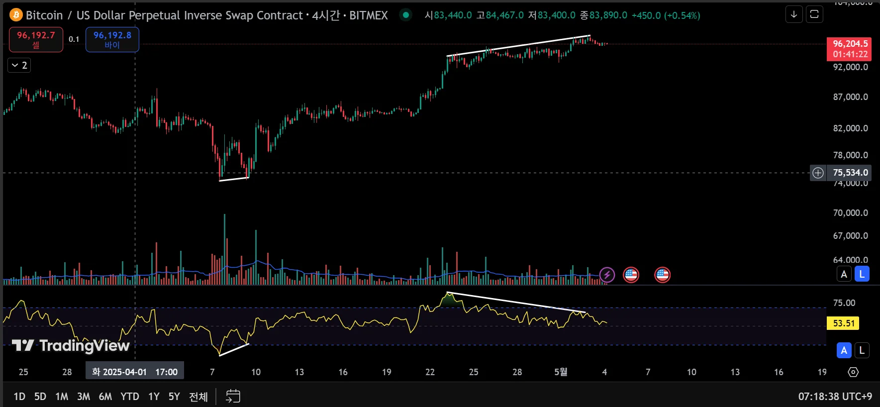 안녕하세요. 4시간봉에서 상승 및 하락 다이버전스 확인하였습니다. 감사합니다.