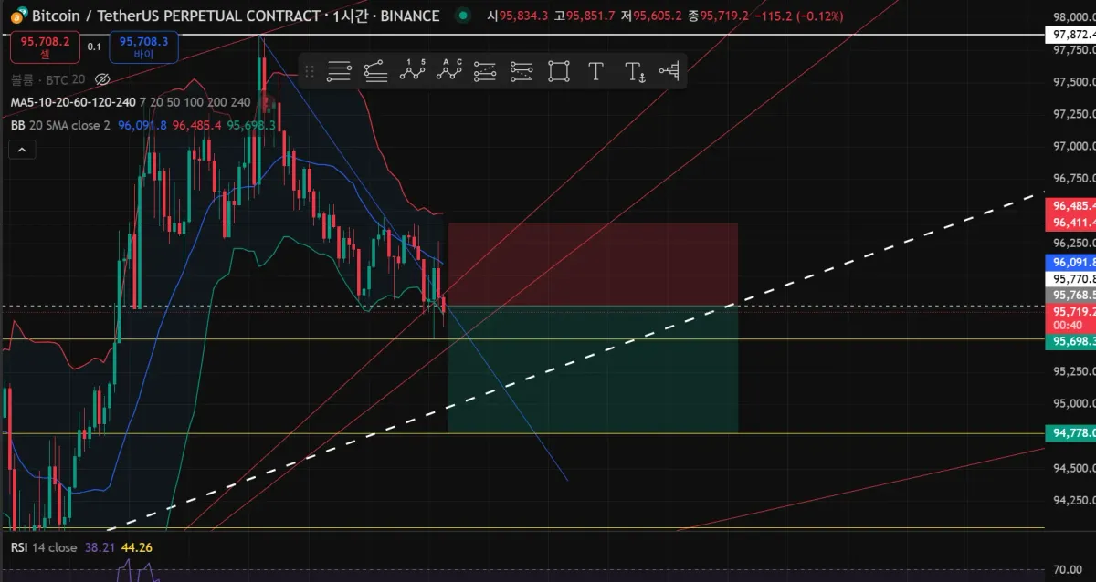 지지, 저항 세팅 한 뒤, 숏 포지션으로 진입해보았습니다.