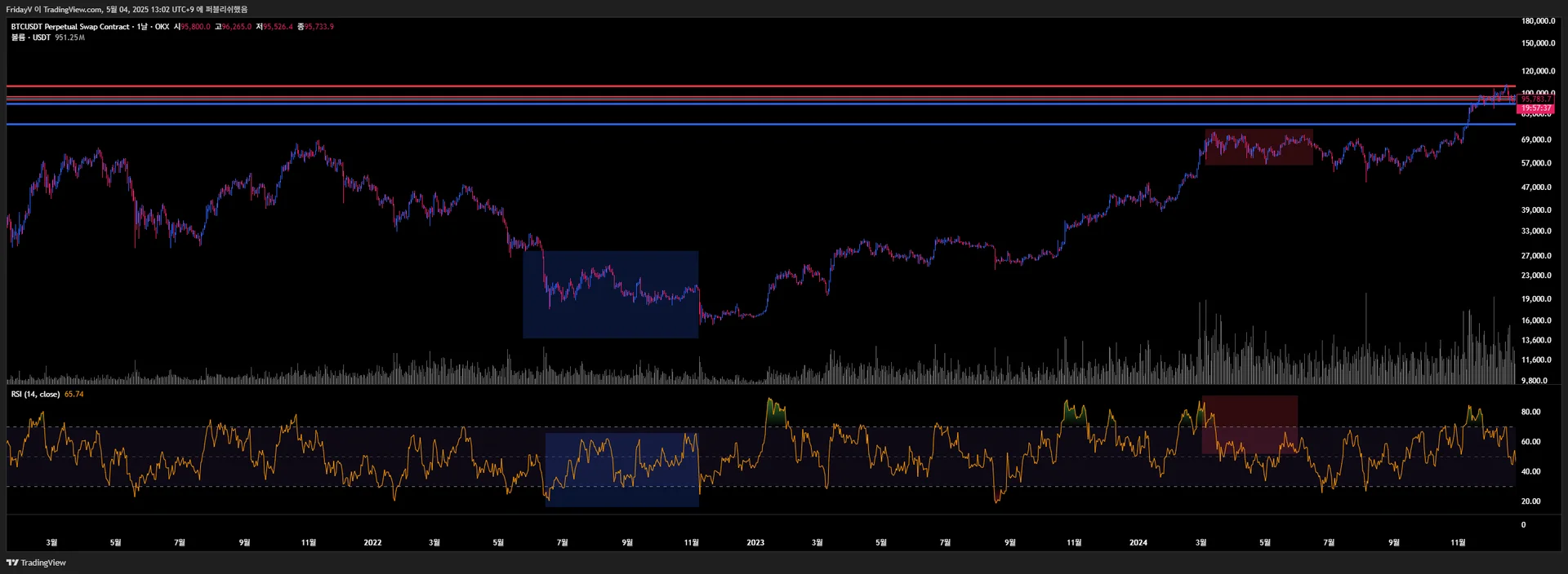 빨간색 음영은 하락다이버전스 확인 가능합니다.