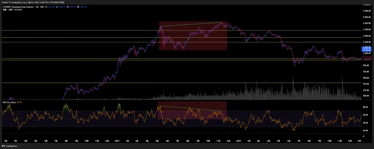 ETH 1일 봉 기준 RSI 활용한 다이버전스 입니다.