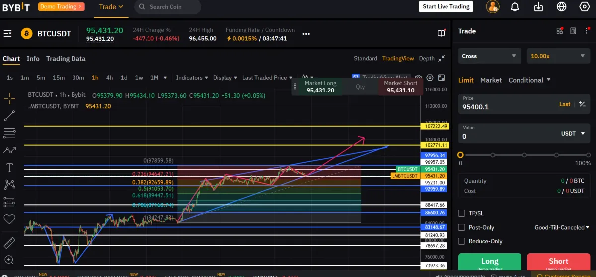 이 상황에서 롱포지션으로 진입해 TP :100,000 SL :92,595 로 설정하려고 했습니다.