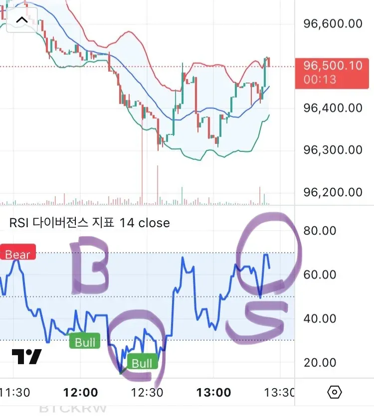 볼린저밴드 하단에서 매수. 상단에서 매도