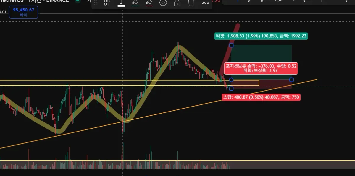 수렴 이후 상단 저항선을 돌파 후, 리테스트 받고 있다 판단 하여 롱으로 진입함