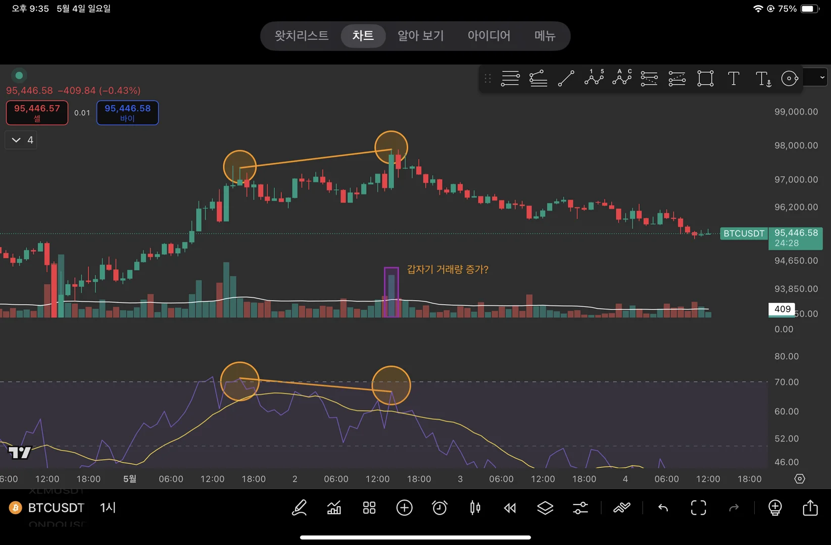 1시간봉 차트에서 하락 다이버젼스로 보여지는데 맞을까요?? 가격은 상승중인데 거래량은 하락하고 RSI 상으로도 맞는거 같은데 마지막 거래량이 뛴게 하락 다이버젼스로 볼수있는건지 잘 모르겠습니다 !