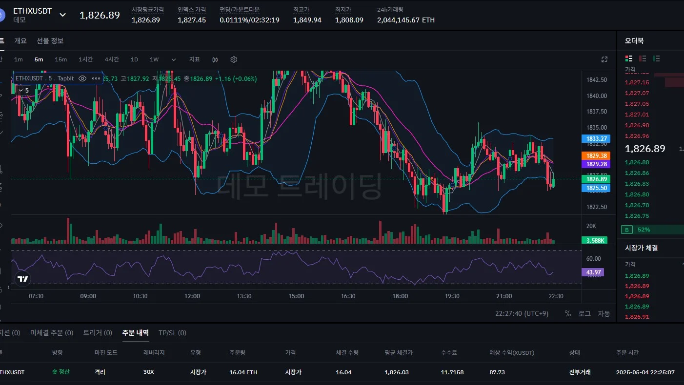 휴일이라 그런지 거래량도 적고 변동성도 적어 볼린저밴드와 RSI만으로 이더리움 선물 데모거래를 해보았습니다.
