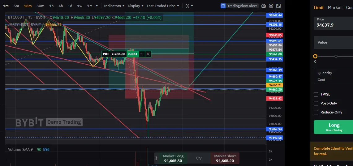 폴링웻지 쐐기 끝쪽까지 하락할거란 판단 , 현 캔들이 고점부터 내려오는 빨간색 추세선을 터치후 하락할거란 생각(숏포지션 진입)