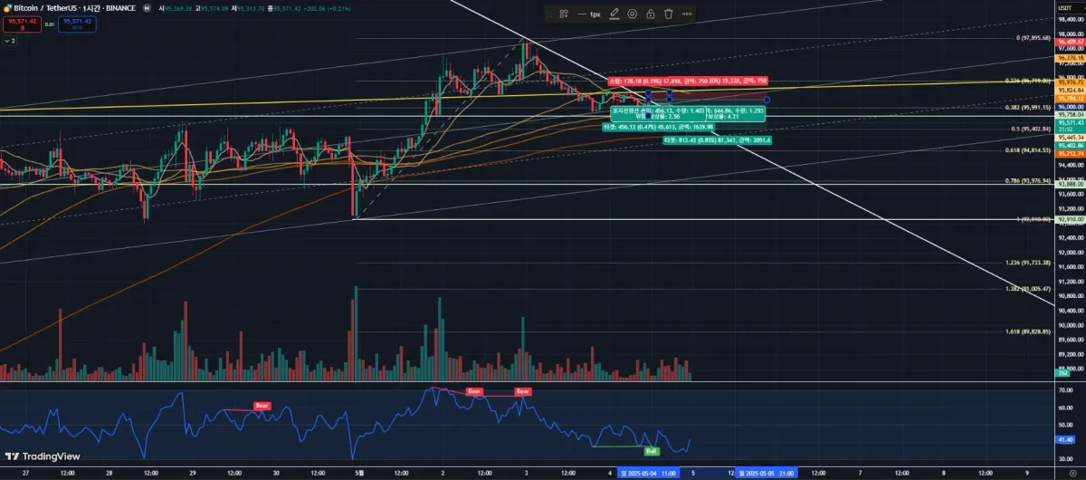 2차 타겟 익절가 피보나치 0.5 95402 잡고 진입 보상율 4.21
