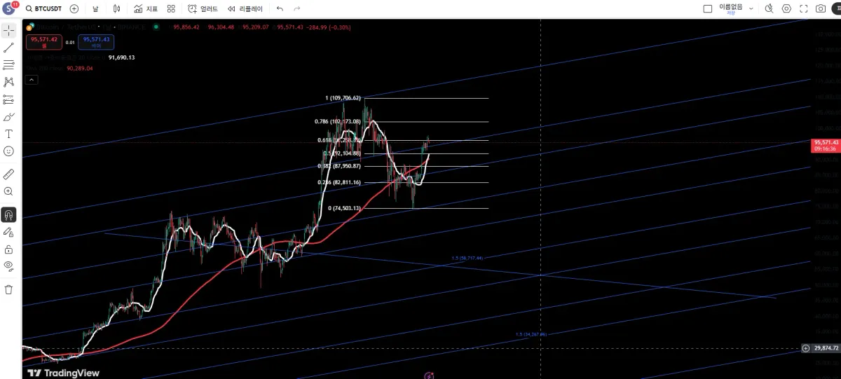 비트코인 날봉기준으로 최고가와 최저가에 대한 피보나치 되돌림을 활용해본 결과 0.618구간에서 저항이 예상되어