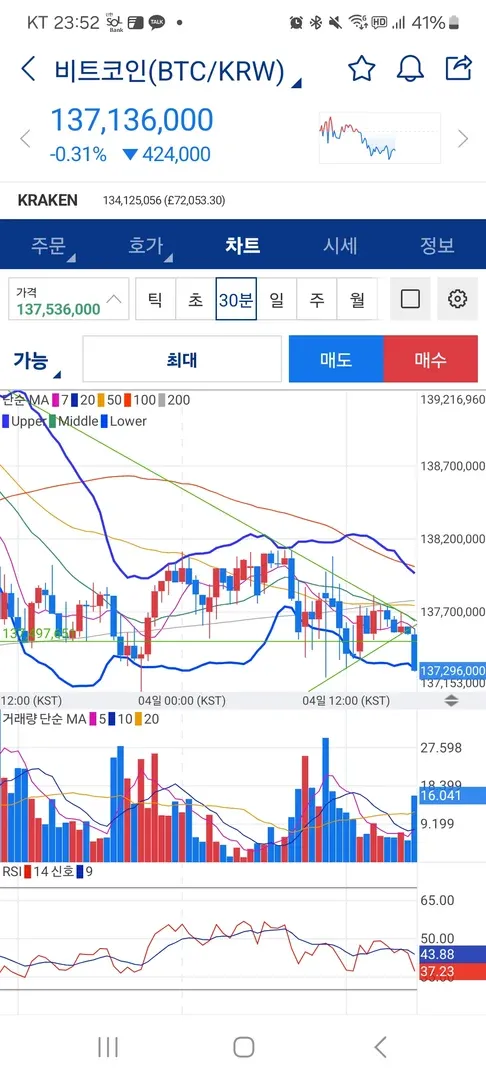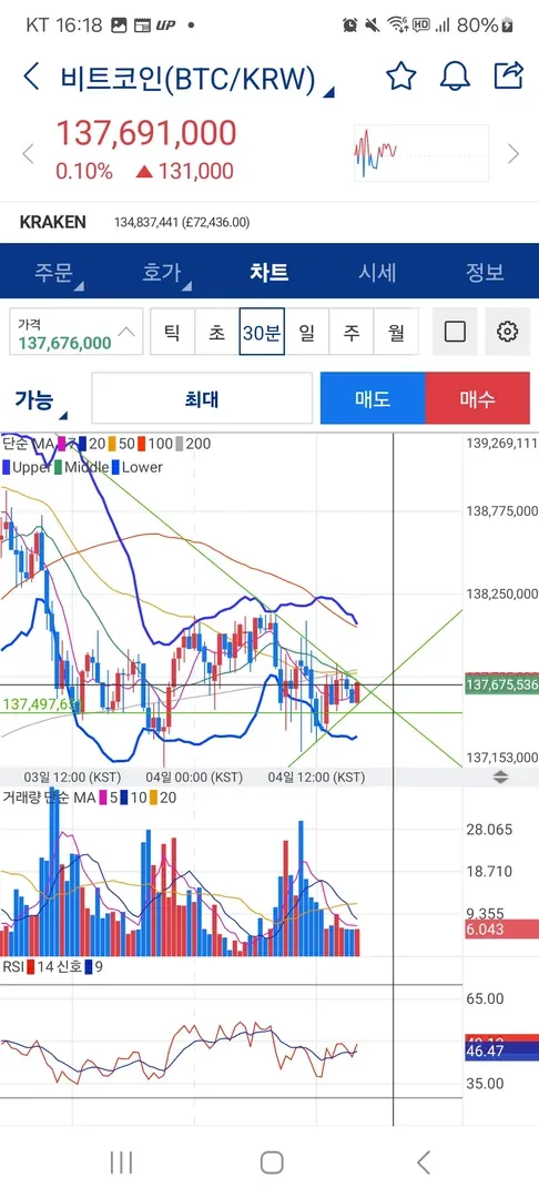 하락 추세선과 상승 추세선이 삼각수렴 패턴을 그리고 볼린저 밴드 하단 터치이후 약간의 상승 기세가 보여 진입하였으나 삼각수렴패턴 완성후 급 하강하여