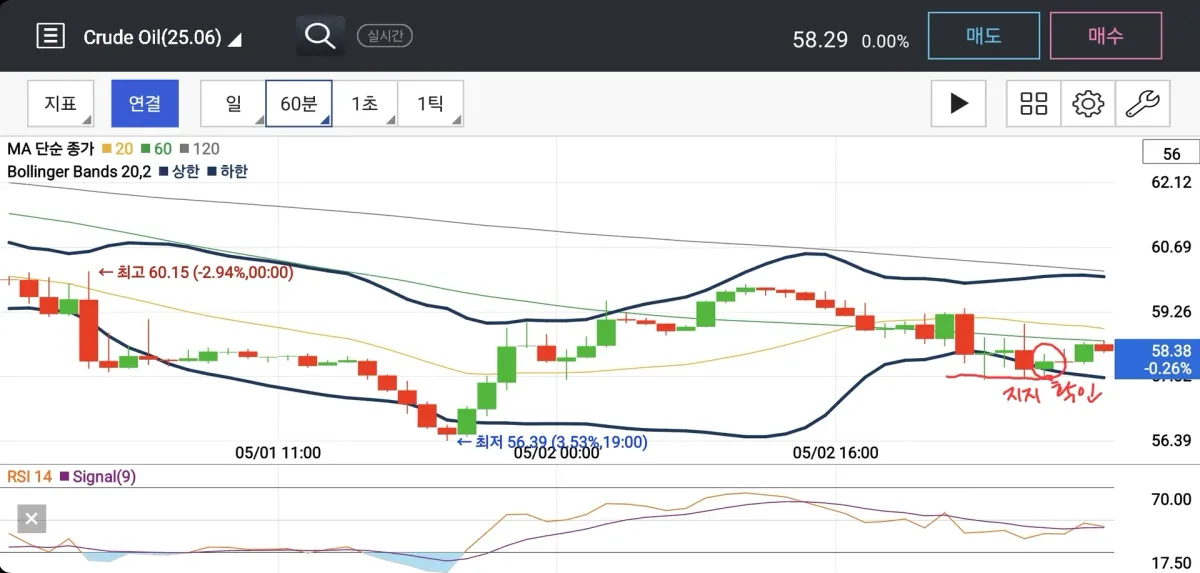 1시간 봉 차트에서 5월 3일 새벽 2시 봉이 위와 같이 앞단 꼬리 달린 곳에서 아래로 더 내리지 않고 재차 지지 받는 것 확인 및 볼린저밴드 내로 유지, PC버전에서는 피보나치로 해당 2시 봉이 정확히 0.618에서 지지 받는 것 확인 세부 타점 위해 3분봉으로 넘어감