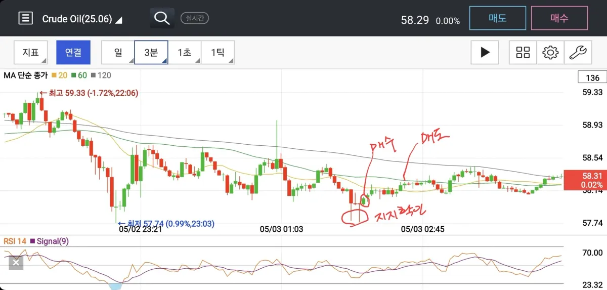 3분 봉에서 01:54. 01:57, 2:00 봉이 모두 지지받는 것을 보여줌, 2:03분봉 마감이 상승 확인 되어 바로 진입, 2:45분에 매도