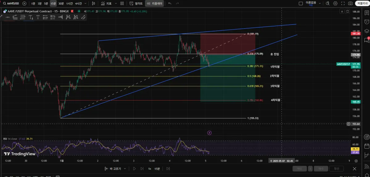 마찬가지로, 피보나치 0.236부근에서 숏 진입하였고, 1차 익절 완료 된 상황입니다 수렴형 다이아고날도 보이는 것 같은데(맞는지모르겠음) 지금 저 하단 추세선을 하방 돌파하여서 추가 하락을 더 보고 있습니다. 4차까지 분할 익절 걸어놓았고, 본전스탑걸어놓았습니다. 수익률은 크지만 소액 진입이라 수익금은 그닥 크지 않습니다 ㅎㅎ