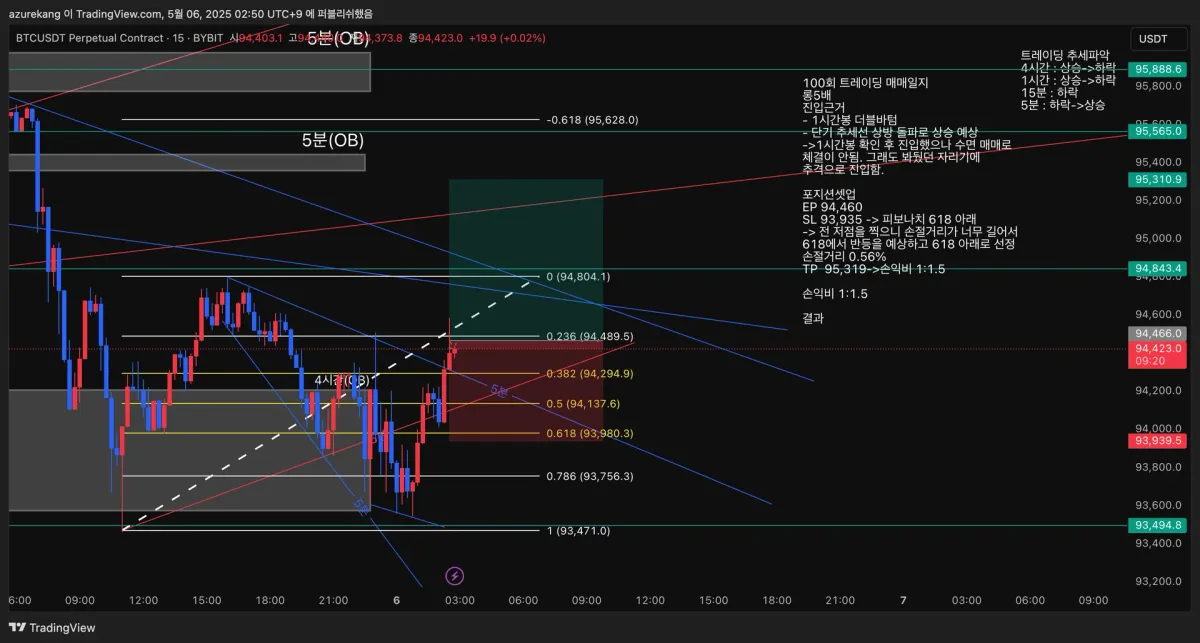 • SL 93,935 -> 피보나치 618 아래 -> 전 저점을 찍으니 손절거리가 너무 길어서 618에서 반등을 예상하고 618 아래로 선정 손절거리 0.56%