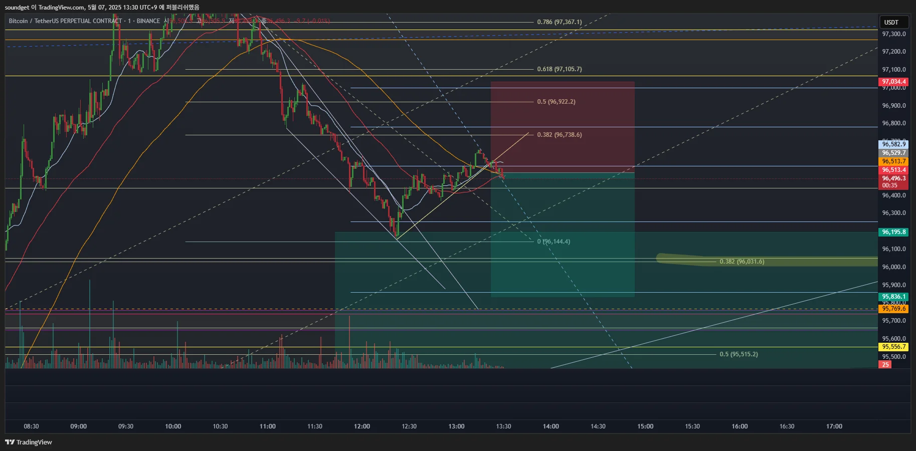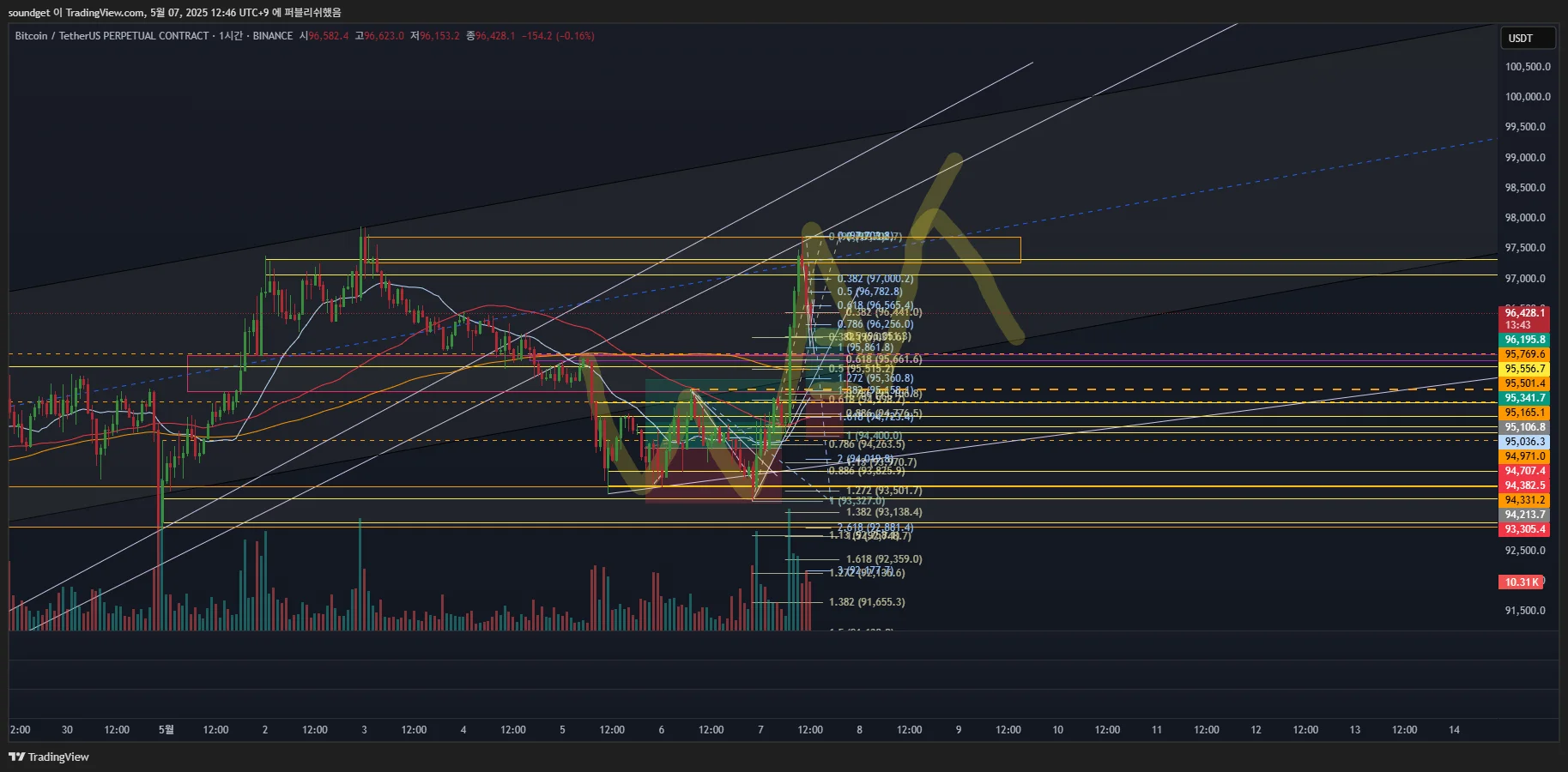 진입:96555.5/익절:95836.1/스탑:97034.4/손익비 1:1.5---->수익구간1%넘어서 조정 ----->96555.5/96054.5/96943.2/1:1.29