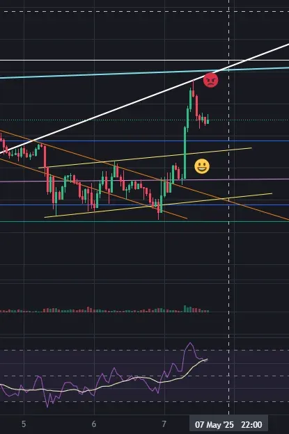 스마일 지점에서 하락 채널 돌파 후에 롱포지션 진입했다가,빨간 이모티콘 구간(아까 말한 상승추세 저항라인)에서 익절 후 , 숏으로 스왑 했습니다.