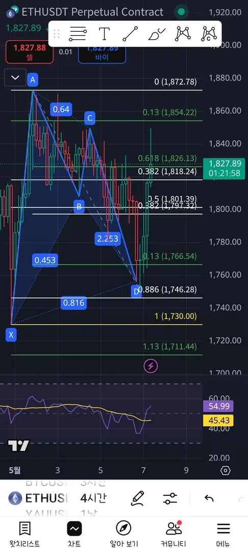 rsi가 과매도 구간이 아니길래 AD피보나치 0.13 즈음에 들어갔고