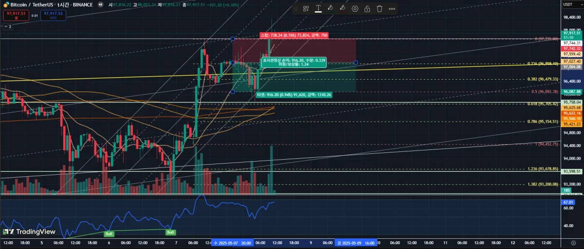 상승분에 대한 피보나치를 그려서 0.236에 진입 0.5에 절반 익절을 걸고 SL는 고점에 걸었음.