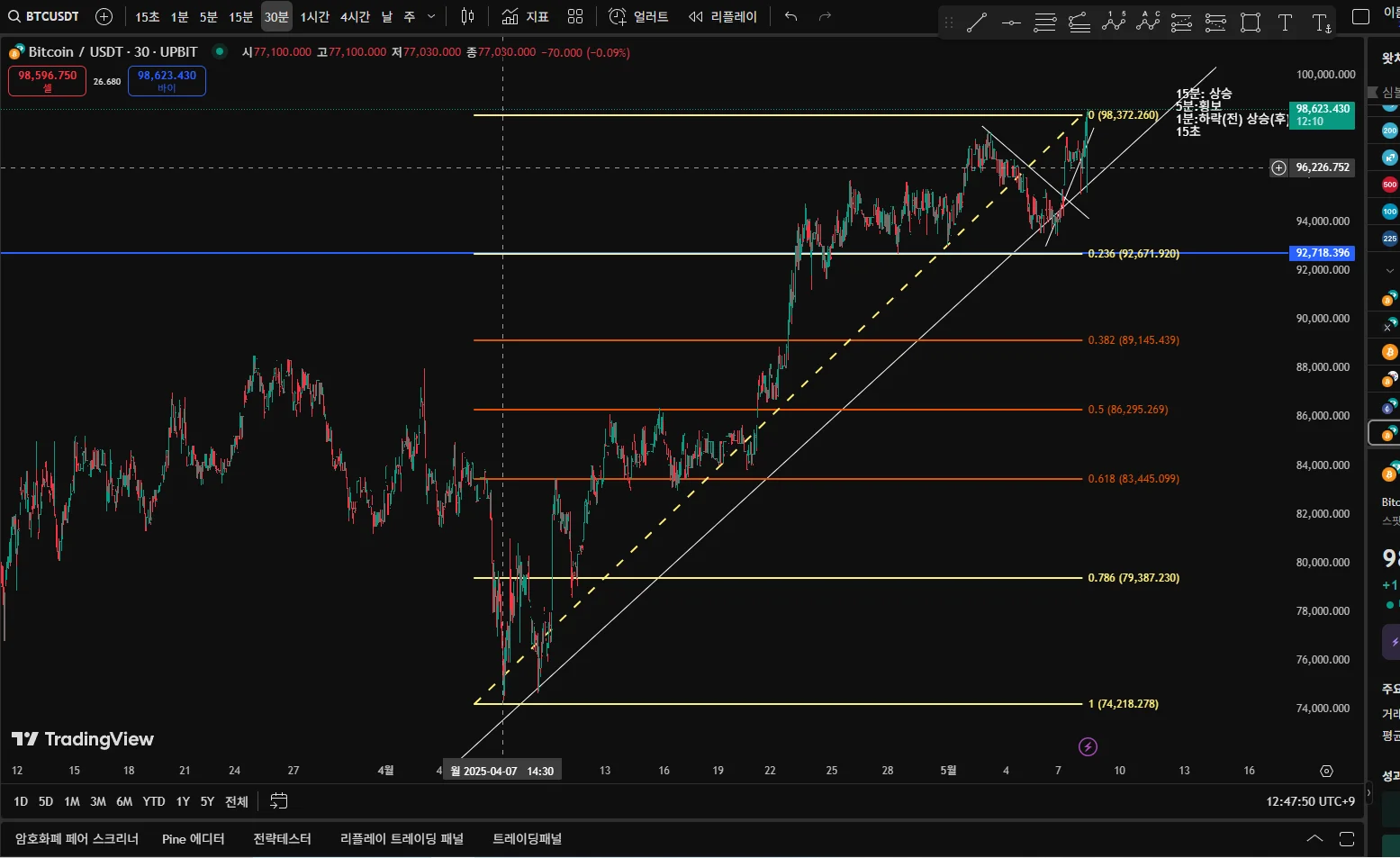 올려주신 차트를 보면, 상승 추세선 안에서 고점을 기준으로 피보나치 리트레이스먼트를 그려놓으셨고, 0.786 구간(약 86K)까지 하락을 열어놓고 계신 상황으로 보입니다. 피보나치 0.786 구간은 깊은 조정의 기준이 되기도 하며, 특히 이전에 가격이 여러 번 반응한 적이 있다면 강한 지지로 작용할 수 있습니다. 말씀대로라면 이 구간까지의 조정 가능성을 열어두는 것은 나쁘지 않다고 생각합니다!