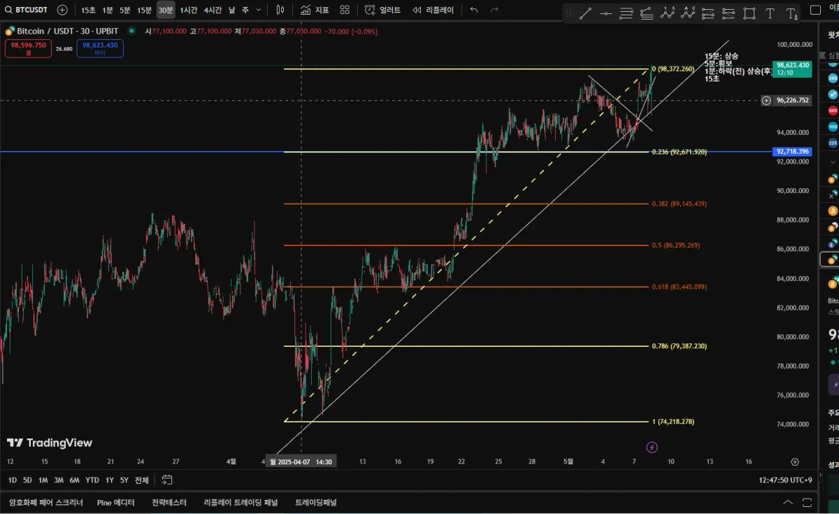 올려주신 차트를 보면, 상승 추세선 안에서 고점을 기준으로 피보나치 리트레이스먼트를 그려놓으셨고, 0.786 구간(약 86K)까지 하락을 열어놓고 계신 상황으로 보입니다. 피보나치 0.786 구간은 깊은 조정의 기준이 되기도 하며, 특히 이전에 가격이 여러 번 반응한 적이 있다면 강한 지지로 작용할 수 있습니다. 말씀대로라면 이 구간까지의 조정 가능성을 열어두는 것은 나쁘지 않다고 생각합니다!
