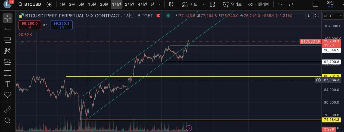 - 만약 매매를 하게 된다면 98044에서 1차 지지의 움직임을 확인하고 지지 + 추세선 안으로 들어올 경우 상승 배팅