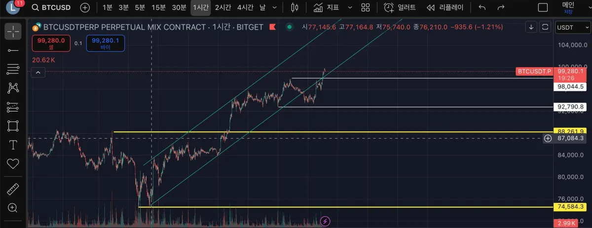 • 만약 매매를 하게 된다면 98044에서 1차 지지의 움직임을 확인하고 지지 + 추세선 안으로 들어올 경우 상승 배팅