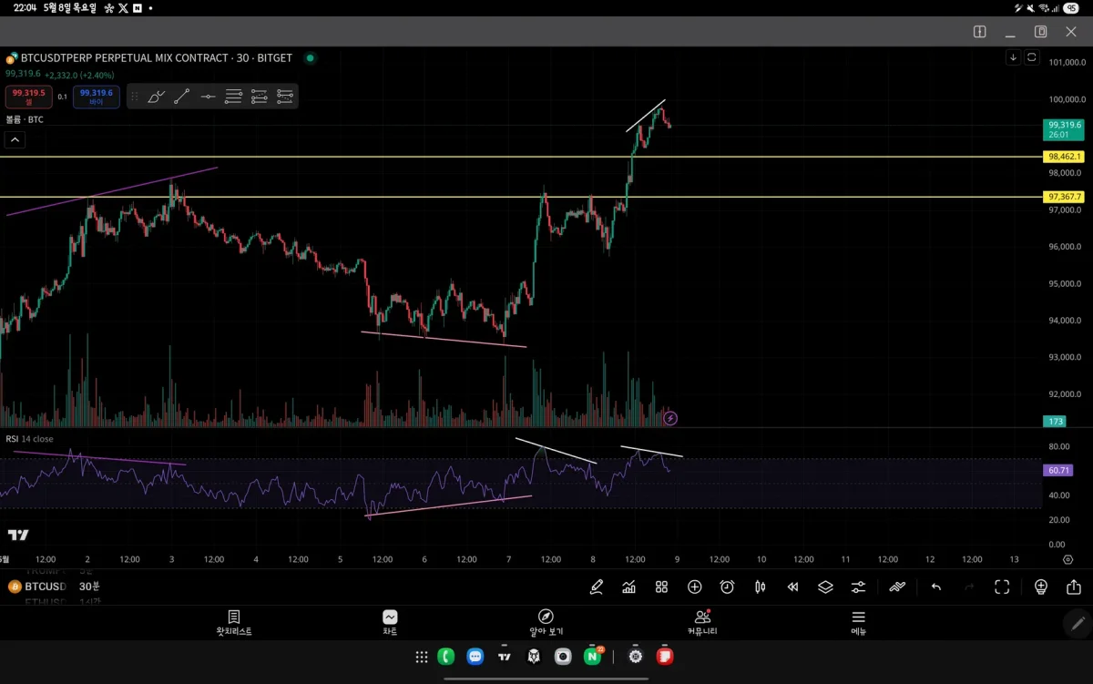 30분봉 상 하락다이버전스가 떴고 피보나치로 최소 0.786 또는 0.618까지 되돌림을 주고 100k에 안정적으로 안착해서 상승이 예상됩니다!