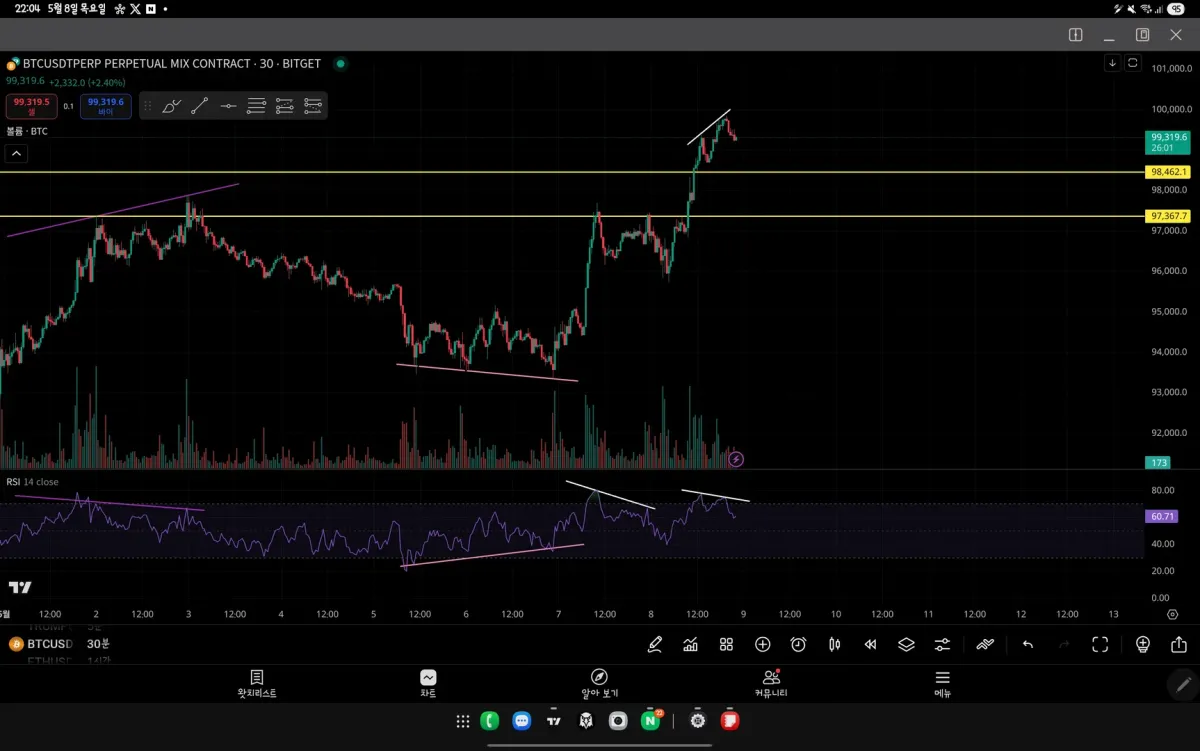 30분봉 상 하락다이버전스가 떴고 피보나치로 최소 0.786 또는 0.618까지 되돌림을 주고 100k에 안정적으로 안착해서 상승이 예상됩니다!
