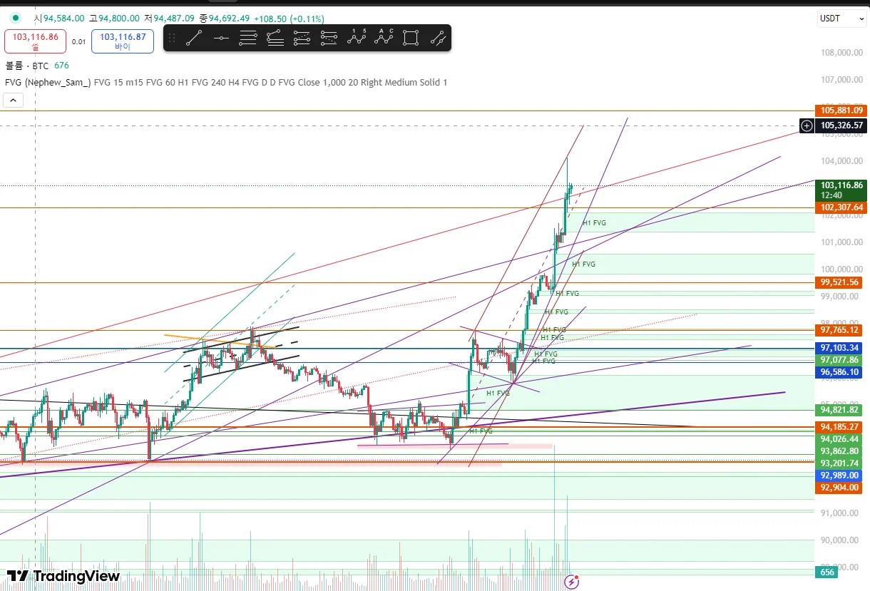 그리고 추세선을 긋은후 1시간봉에서 도 지지와 저항선, 추세선을 찿아서 같은 작업을 반복하고 보정해 보았습니다