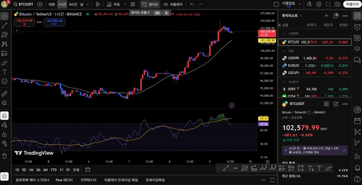 강의에서 배운대로 RSI지표를 추가해서 보니 지금은 과매수 구간에 들어와있구나 싶네요
