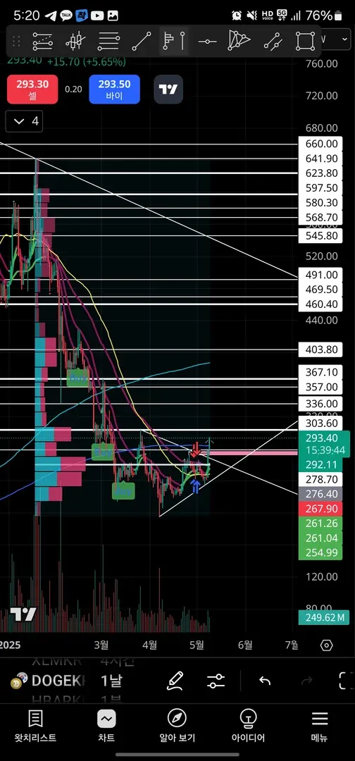 장세가 너무 상식을 벗어나고있어 현물로 매매를 진행했습니다. 종목은 도지코인이고 주요 매물대 돌파하여 ob에 막힐것이라 예상했으나 콧방귀라도 뀌듯 강한 거래량을 동반한 돌파가 진행되어 불타기 들어갔고 303에 저항 예상했으나 욕심 버리고 볼래 설정해둔 손익비 지켜서 익절했습니다.