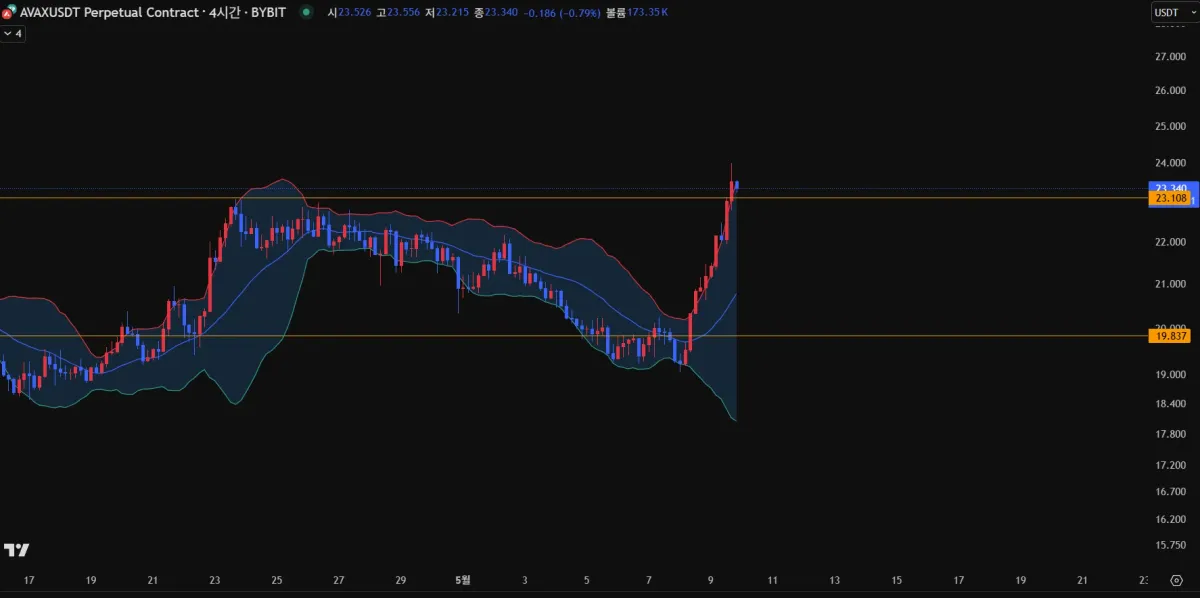 19.837usd에서 볼린저밴드 중단선 돌파와 함께 추격 매수진입.
