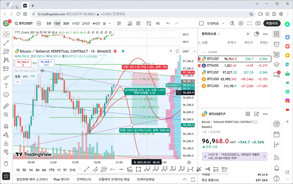 위의 매매는 손절로 최종마무리가 되었습니다. 하루에도 3~5번정도 단기트레이딩을 하고 있는데, 이번 대상승장에 지독히도 물리고 손절이 나갔네요...ㅠㅠ
