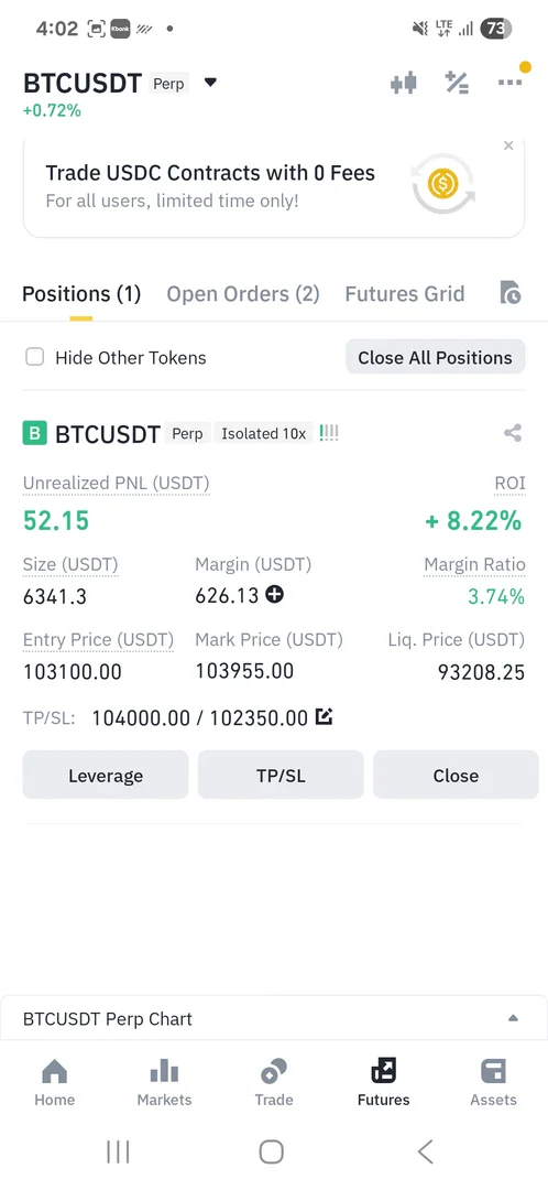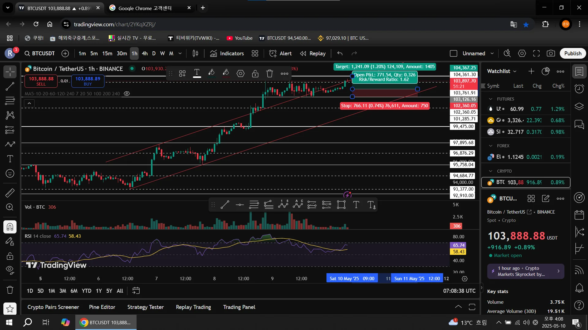 하단 지지선 지지하는거 지켜보다가 전고점 10.4K 돌파시도할거 같아서 롱포지션 진입해서 수익실현했습니다. 아직 추세선 그리는게 헷갈리는데....진입근거가 부족함에도 초심자의 행운이 따른거 같습니다.