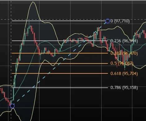 5/7일 아침 7시 이후 임펄스가 있어 피보나치되돌림으로 382지점에 롱 10배로 들어가 7.62% 이익실현함.