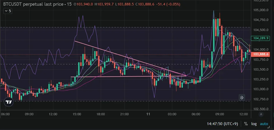 RSI는 가격이 과매수 또는 과매도 상태에 있는지를 판단하는 기술적 지표이다. RSI가 이전의 하락 추세선을 상방 돌파하면서, 모멘텀 변화가 나타났다. 이때 실제 가격도 상승세로 전환되었음. 현재 RSI가 하락 추세로 접어드는 중이므로, 추가 하락 or 반등 여부는 RSI가 30 부근 근접 혹은 다시 반등하는지 여부에 따라 판단 가능함