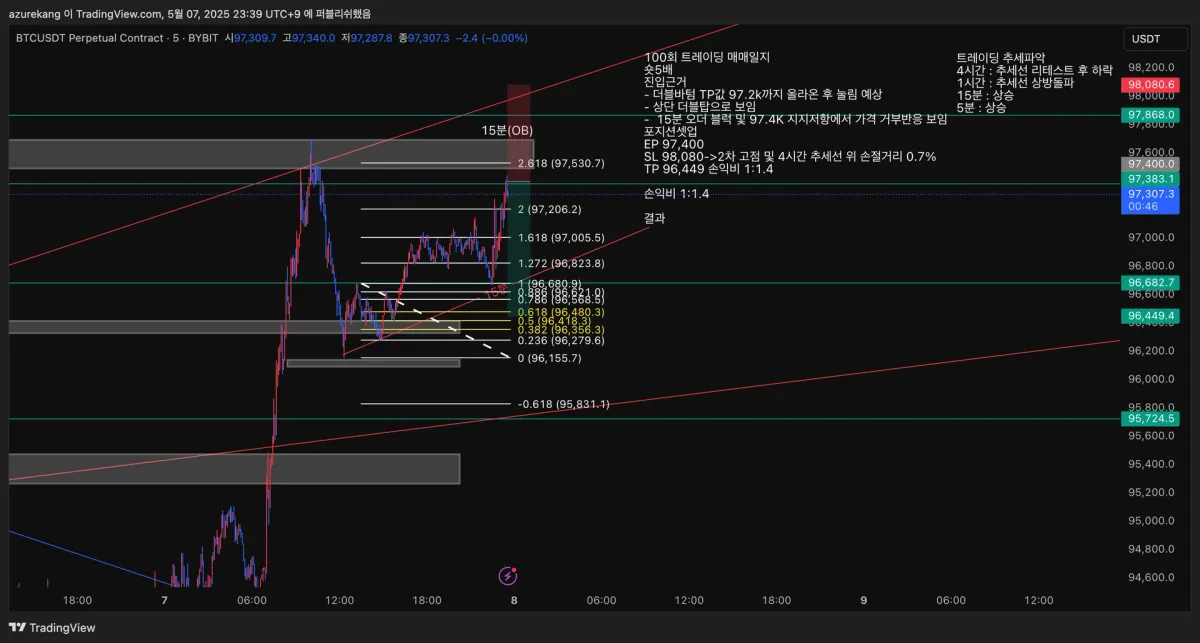 - 15분 오더 블럭 및 97.4K 지지저항에서 가격 거부반응 보임