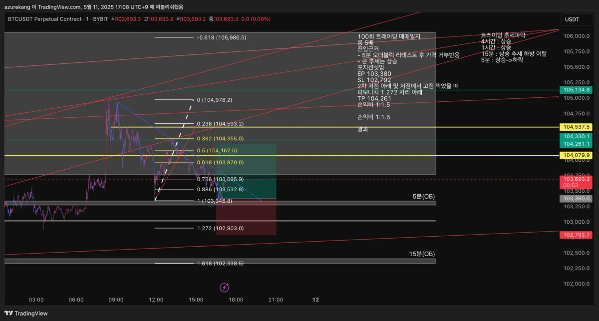 - SL 102,792 2차 저점 아래 및 저점에서 고점 찍었을 때 피보나치 1.272 자리 아래