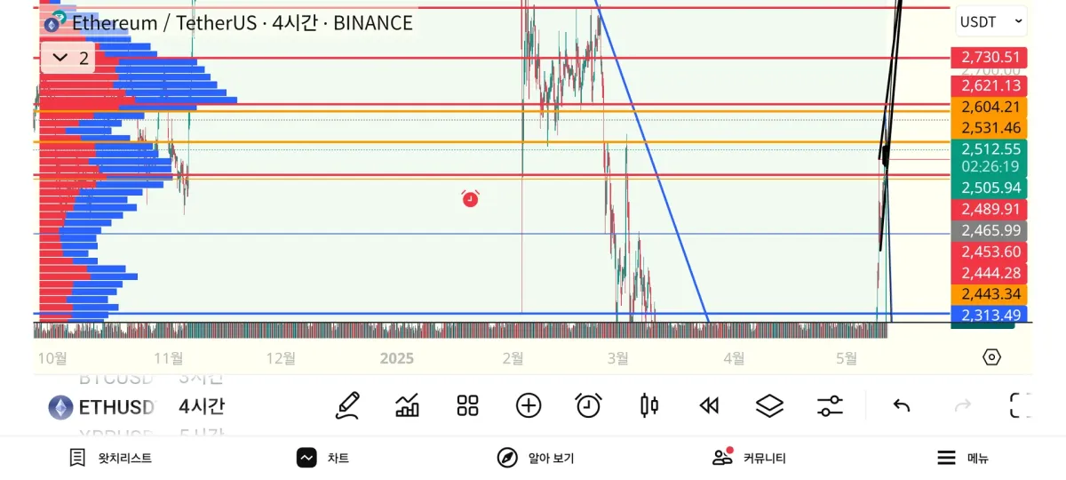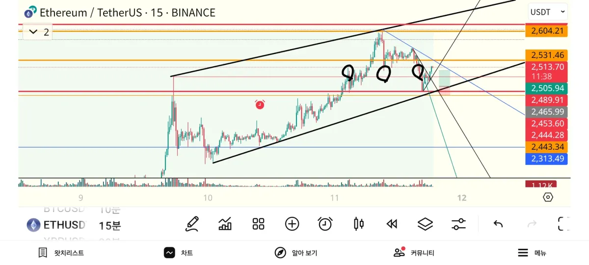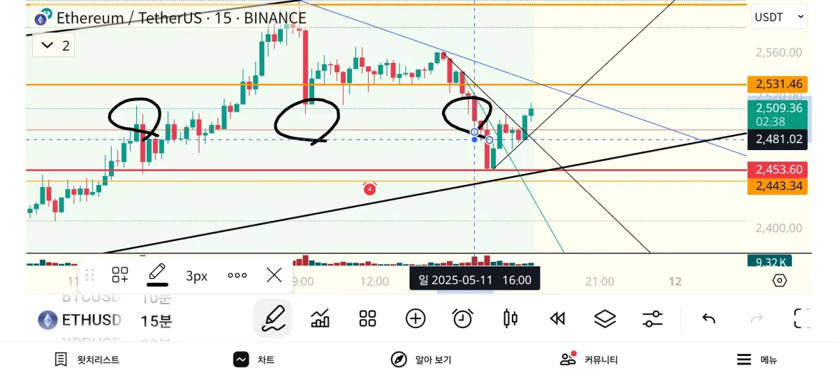 1. 상승 추세선과 거래량 동반된 전고점(2489)캔들의 저점