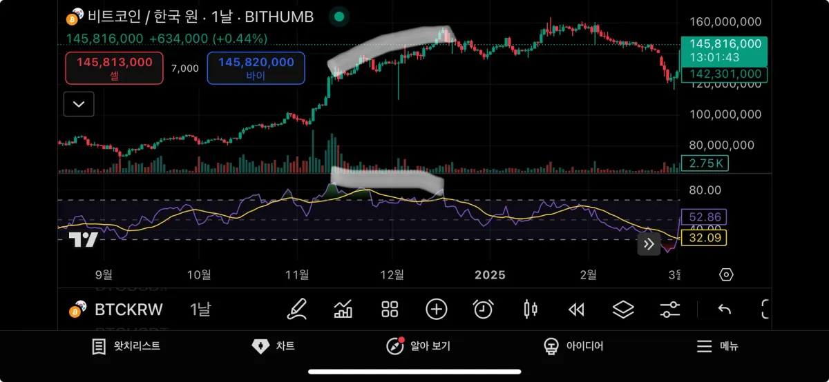 표시 된 부분과 같이 매수세를 보이고 있지만 RSI는 가격 상승에 비해 떨어진 것을 확인할 수 있습니다.