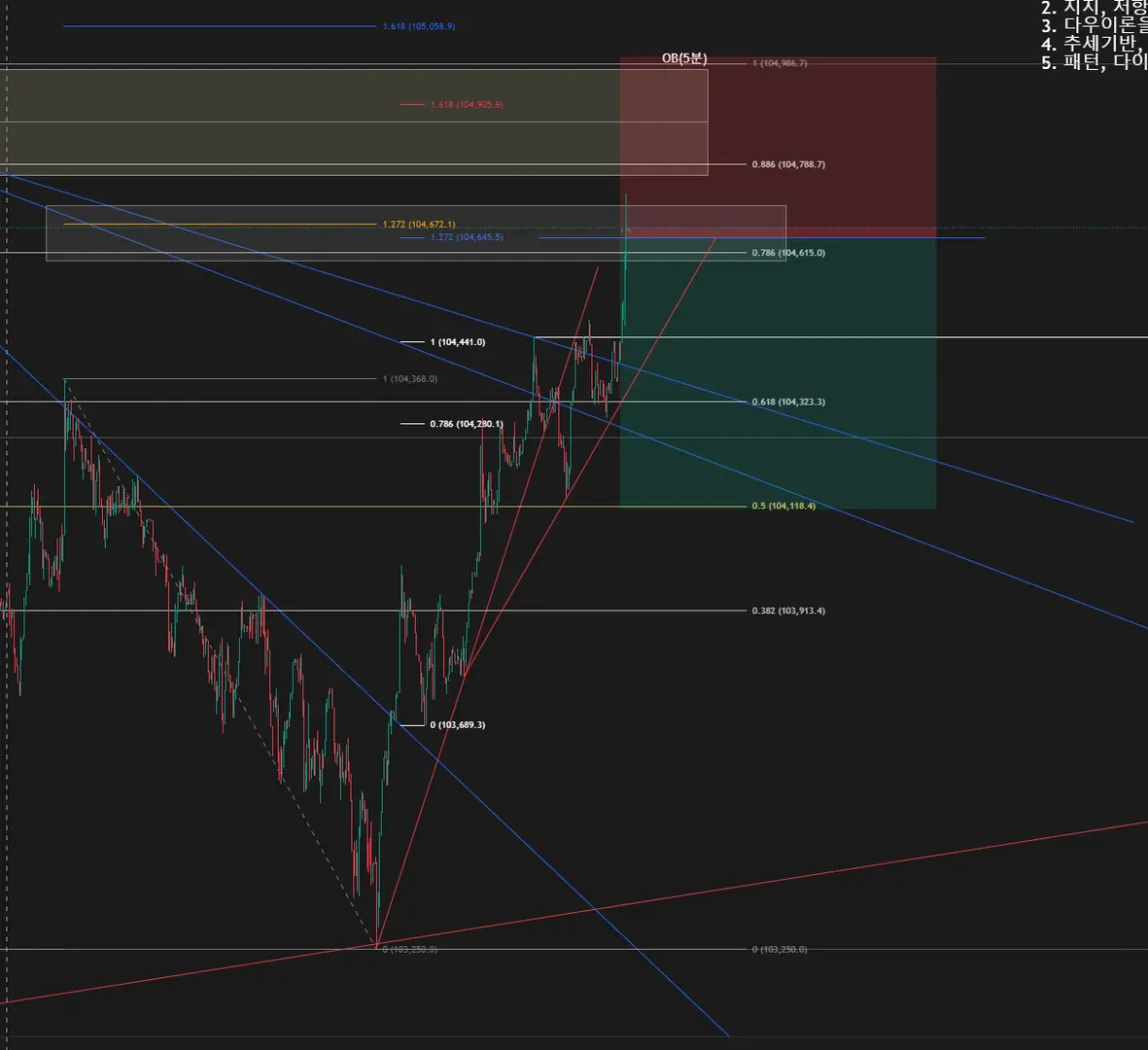 3) SL: 104998.8 - 오더블럭과 전고점을 넘기면 상승으로 추세가 전환 될 것이라 판단됨