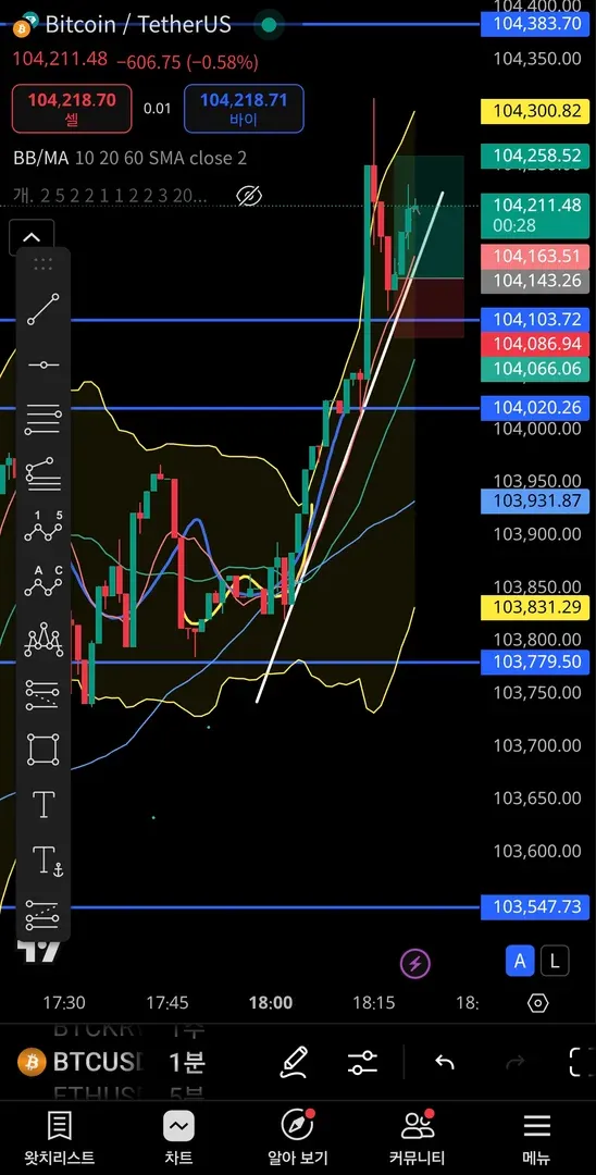 이평선과 주가의 더블바텀과 추세선의 지지, 전 고점의 지지 등을 바탕으로 롱을 잡아 익절하였습니다.