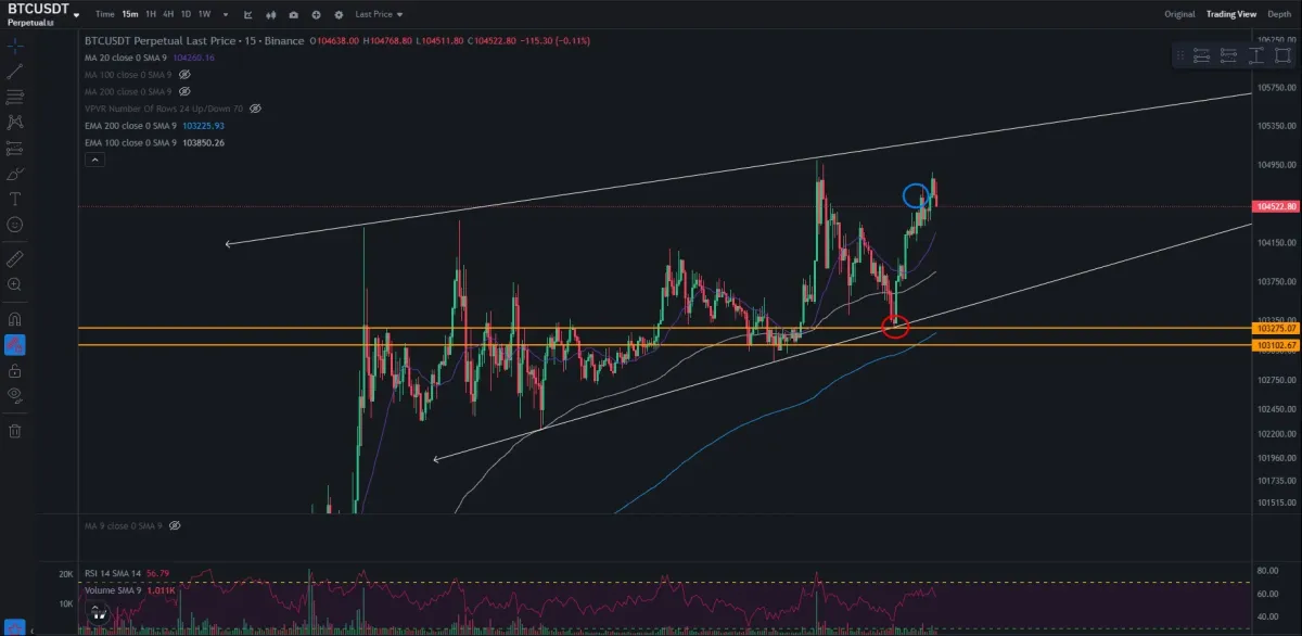 103,300 부근 지지라인 및 채널에 3번째 터치구간이 중복됨에 따라 진입. 전고점 인근 매도 (ps. 조금더 욕심부려서 채널 상단 터치시까지 가져 갈수 있었지만 욕심을 버리고 전량 익절)