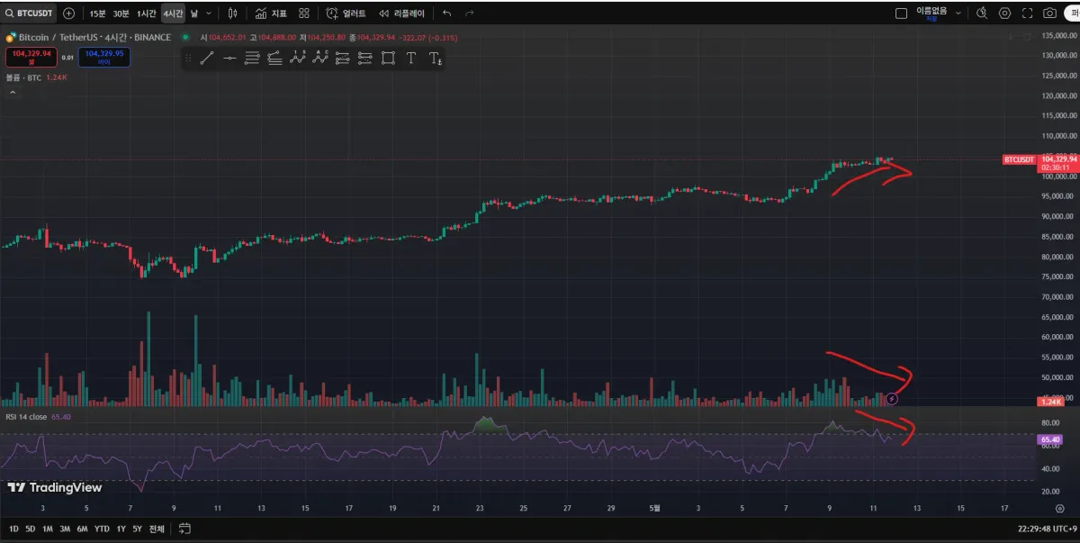 끝부분에서 가격은 상승하고 있지만 상승세가 둔화되고, 거래량도 줄어들고 있으며, rsi 도 과매수구간을 벗어났습니다.