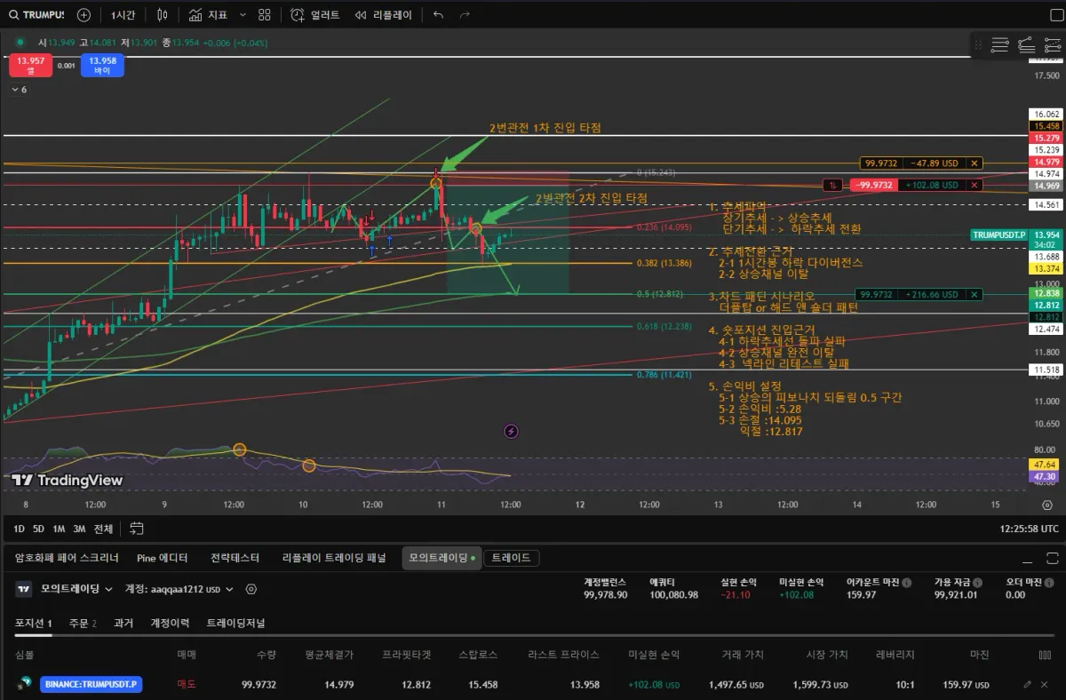 기술적 분석 강의를 듣고 연습중이여서 모의 트레이딩 으로 연습중이지만 배운 내용을 토대로 진입 근거와 관점을 세우고 실천해 보았습니다.